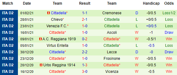 + Thống kê 10 trận gần nhất của Cittadella