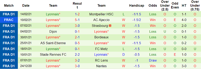 Tuy thuộc nhóm ứng viên vô địch nhưng tỷ lệ thắng kèo của Lyon tại Ligue 1 mùa 2020/21 tương đối khiêm tốn: 44.00%. Tỷ lệ thắng kèo của Lyon tại Ligue 1 mùa này thậm chí còn thấp hơn so với Brest: 48.00%.