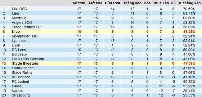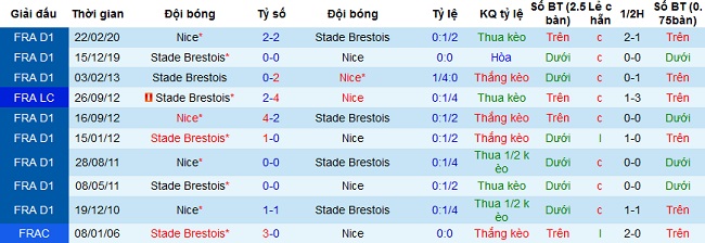 + Soi tỷ lệ kèo châu Á: Hiện tại Brest vẫn được đánh giá cao hơn với kèo chấp -1/4 khi họ được chơi trên sân nhà. Tuy nhiên tỷ lệ thắng thua kèo của Brest trong các trận gần đây là ngang nhau. Trái lại Nice tuy thua kèo khá nhiều trong các trận đấu gần nhất, lý do là đội bóng tham dự cả Europa League. Còn tại giải quốc nội trong các lần du đấu Nice đều thắng kèo. Thế nên chọn cửa dưới ở lần đối đầu này sẽ là sự lựa chọn hợp lý.