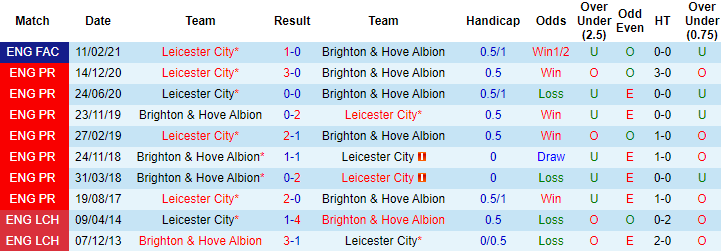 Leicester đang có dấu hiệu sa sút rất rõ vì liên tục phải cày ải tại Europa League và Ngoại hạng Anh. 3 trận gần đây Bầy cáo bất thắng với 2 thất bại và 1 trận hòa. Trong khi đó Brighton dù thành tích chưa cao nhưng vẫn thể hiện được khả năng tận dụng lợi thế sân nhà, 6 trận tiếp khách vừa qua họ bất bại 7 lần.