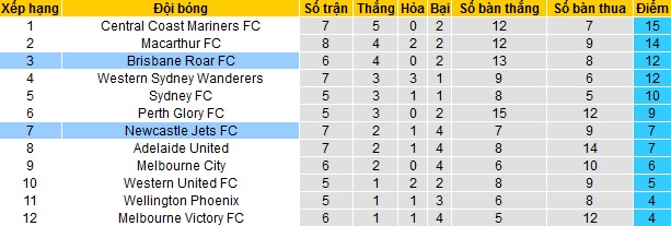 Trong khi đó Newcastle Jets đã tạm vươn lên vị trí thứ 7 trên bảng xếp hạng. Với 7 điểm sau 7 vòng đấu, Newcastle Jets đang còn cách Top 6 đúng 2 điểm, nhưng cũng chỉ hơn cả 2 đội đứng cuối bảng có 3 điểm.