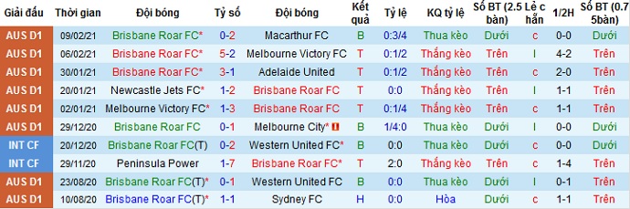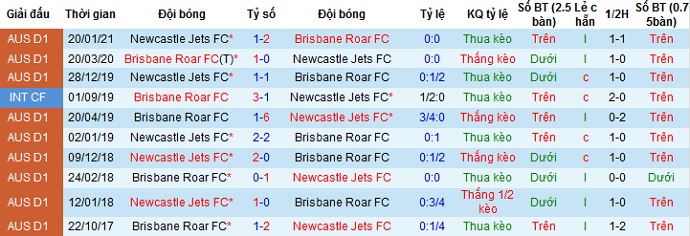 Ngoài ra trong 4 lần đối đầu gần nhất giữa hai đội thì Brisbane Roar cũng có tới 3 lần giành chiến thắng. Tuy nhiên phong độ gần đây của Brisbane Roar lại khá thất thường, trong khi Newcastle Jets thi đấu không tệ trên sân khách cũng như đang có phong độ được cải thiện, nên chọn cửa dưới ở trận đấu này có phần hợp lý hơn.