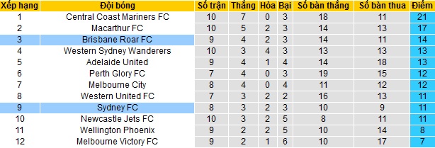 Bảng xếp hạng giải VĐQG Úc vòng 10