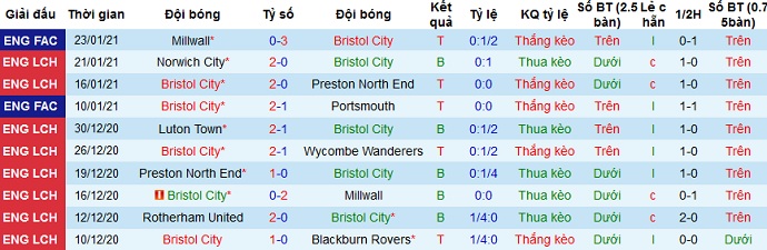 Trong 5 trận gần nhất Bristol có được 3 trận thắng và 2 trận thua, tính cả 2 trận thắng tại FA Cup. Nếu tính riêng tại giải hạng nhất, ở 5 vòng đấu gần nhất Bristol chỉ có được 2 trận thắng và để thua 3 trận. Ngay cả trên sân nhà Bristol cũng đang để thua 2 trận trong 5 trận gần nhất tại đây.