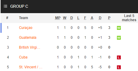 Tại vòng loại thứ nhất khu vực Concacaf, Guatemala rơi vào bảng C, nơi có Curacao, Cuba, St. Vincent và Bristish Virgin Islands. Nhìn vào tên tuổi của 5 đội, NHM dễ nhận ra sự nhỉnh hơn từ phía Curacao và Guatemala. Cuộc chiến giành ngôi đầu bảng được cho là sẽ diễn ra giữa 2 ĐT này.