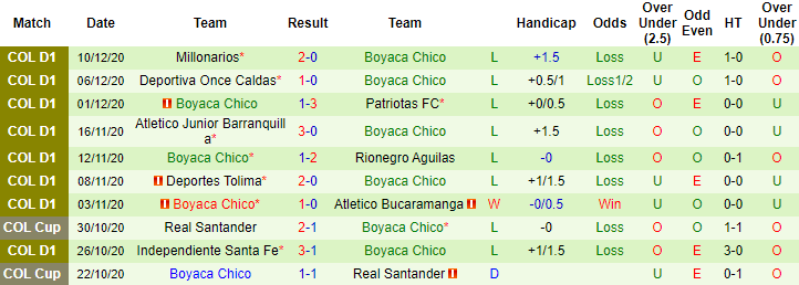 Bên phía đối diện, Boyaca Chico đang có chuỗi 6 trận liên tiếp toàn thua cả về tỷ số và kèo châu Á. Trên sân khách, Boyaca Chico càng khó vớt vát niềm tin nơi người hâm mộ. 9 trận xa nhà gần đây tính trên mọi đấu trường, Boyaca Chico toàn thua, 8 trận thủng lưới ít nhất 2 lần.