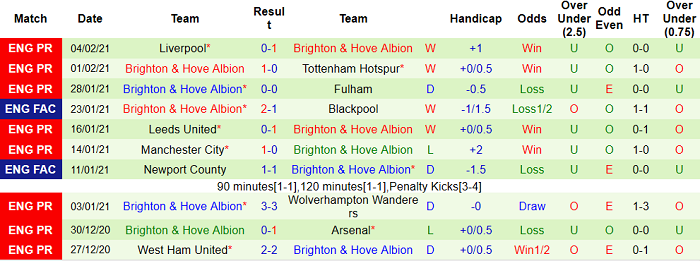 Các trận đấu gần đây của Brighton luôn có ít bàn thắng. Cả 5 màn so tài gần nhất của họ tại giải Ngoại hạng Anh đều không chứng kiến quá 1 pha lập công. Kịch bản tương tự nhiều khả năng tái diễn vào thứ Bảy (6/2).