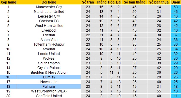 Trận đấu bù vòng 17 giải ngoại hạng Anh sẽ là cuộc đọ sức giữa Burnley và Fulham. Hiện tại Burnley đang đứng thứ 16 trên bảng xếp hạng với 26 điểm sau 23 vòng đấu. Tuy chỉ xếp trên nhóm các đội cầm đèn đỏ có 2 bậc nhưng khoảng cách 8 điểm cũng là tương đối an toàn.