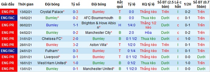 + Thống kê 10 trận gần nhất của Burnley
