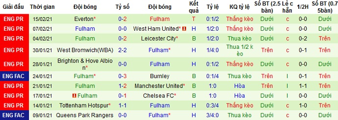 + Thống kê 10 trận gần nhất của Fulham