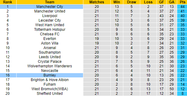 Burnley vẫn luôn là đối thủ yêu thích hàng đầu của Man City. 7 lần chạm trán Burnley gần đây tính trên mọi đấu trường, Man City toàn thắng, ghi 28 bàn và chỉ 2 lần để thủng lưới. Trận đối đầu giai đoạn lượt đi Ngoại hạng Anh mùa này, Man City vùi dập Burnley với tỷ số 5-0.