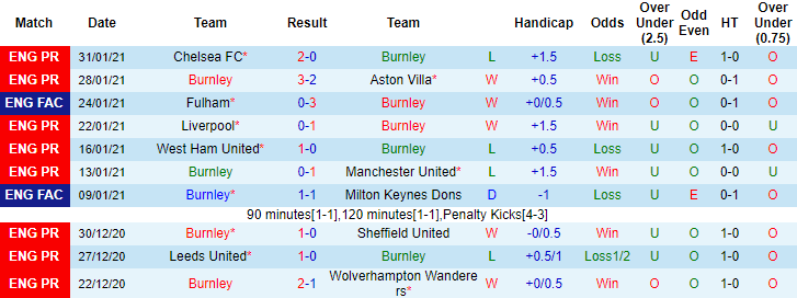 + Thống kê 10 trận gần nhất của Burnley