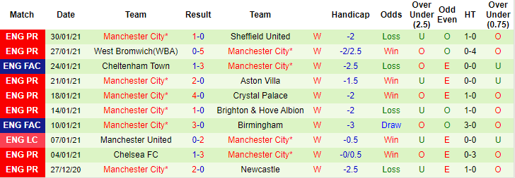 Man City thắng 12 trận liên tiếp trên mọi đấu trường, củng cố vững chắc vị trí số 1 trên bảng xếp hạng Premier League với 3 điểm nhiều hơn MU dù đá ít hơn 1 trận. Nhưng Man City đang dần thi đấu thực dụng hơn, trận gần nhất họ chỉ thắng đội bét bảng Sheffield Utd 1-0 trên sân nhà. 3 trận gần đây Man City thua kèo 2 lần.