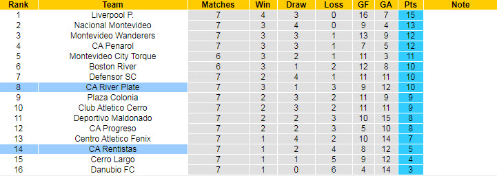 Trong khi đó, đội khách Rentistas bước vào trận đấu đêm nay với phong độ nghèo nàn khi thua 2 trận vừa rồi. Tính tại lượt về, Rentistas thắng duy nhất 1 trận, hòa 2 và nhận tới 4 thất bại sau 7 vòng đã đá.
