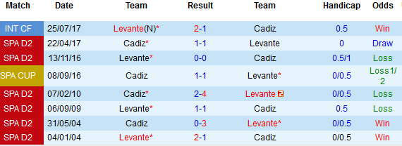 + Lịch sử đối đầu Cadiz vs Levante