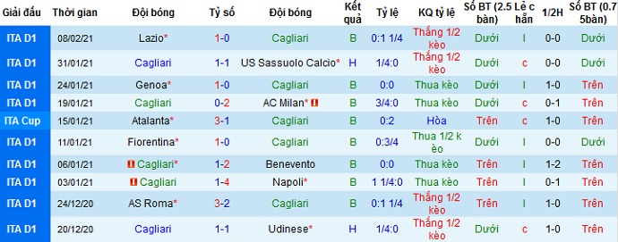 + Thống kê 10 trận gần nhất của Cagliari