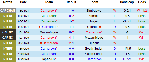 + Thống kê 10 trận gần nhất của Cameroon