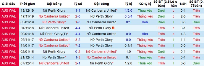 + Soi tỷ lệ kèo châu Á: Với thành tích kém cỏi trong các trận đấu gần đây nên Perth Glory (W) hiện vẫn đang bị đánh giá là đội cửa dưới là hợp lý tuy kèo chấp chỉ là +0,25. Thế nhưng trong 7 lần gặp nhau gần nhất giữa hai đội, đội chủ nhà vẫn đang bất bại khi thắng 4 và hòa 3 trận, nên với phong độ đang lên của Canberra Utd (W) chọn cửa trên là hợp lý.