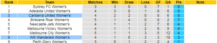 Phong độ và thống kê đối đầu Canberra (W) - Sydney Wanderers (W) gần đây:
