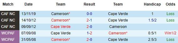 + Soi tỷ lệ kèo châu Á: Lần đầu tiên trong lịch sử Cape Verde ở thế cửa trên khi đụng độ với Cameroon, điều đó cho thấy nhà cái đánh giá cao khả năng chiến thắng của Cape Verde. Cameroon thiếu động lực và họ cũng thua kèo 4/5 trận gần nhất.