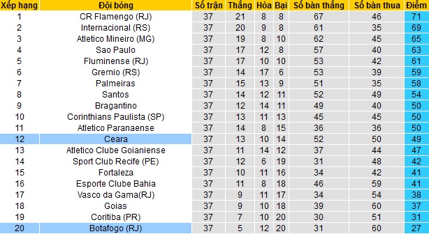 Trong khi đó Botafogo đã chính thức xuống hạng từ cách đây vài vòng đấu. Hiện tại đội bóng cũng đã chắc chắn đứng ở vị trí bét bảng khi mùa giải kết thúc, có được 27 điểm sau 37 vòng đấu, kém đội áp chót Coritiba 4 điểm và kém nhóm trụ hạng tới 14 điểm.