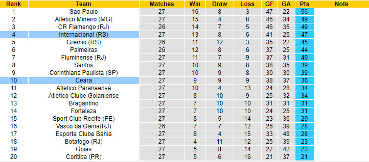Trở lại với vòng 28 diễn ra vào sáng mai, thầy trò HLV Guto Ferreira có trận đấu tiếp đón Internacional trên sân nhà. Tất nhiên, mục tiêu của Ceara sẽ là giành trọn 3 điểm, qua đó củng có vị trí trên BXH.