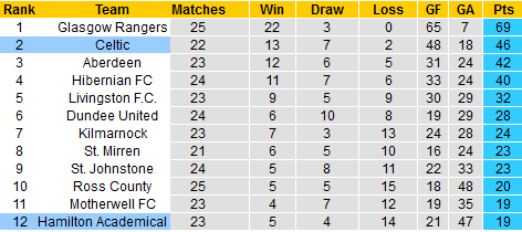 Bởi đơn giản khi đối thủ của họ chỉ là Hamilton đã trở thành mỏ điểm. Đội khách đã thua tới 14 trận sau 23 vòng ở mùa giải năm nay, đứng bét bảng với 19 điểm. Đáng nói, Hamilton là con mồi ưa thích dành cho Celtic khi họ toàn thắng cách biệt từ 3 bàn trở lên trong 3 lần gặp nhau gần nhất.