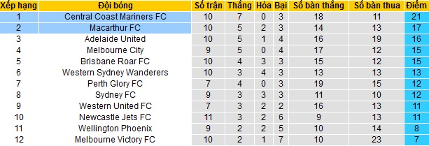 Bảng xếp hạng giải VĐQG Úc trước vòng 11