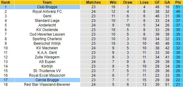 Nhưng đối phương lại là CLB đang dẫn đầu giải đấu và hướng tới chức vô địch. Club Brugge hơn đội xếp sau tới 9 điểm trong khi đang đá ít hơn 1 trận. Chiến thắng là điều cả 2 cùng hướng tới, nhưng rõ ràng thực lực của Cercle Brugge yếu kém hơn hẳn so với đối thủ.