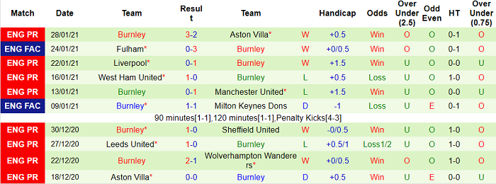 - Thống kê 10 trận gần nhất của Burnley