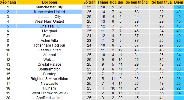 Trong khi đó Man Utd vẫn duy trì được vị trí thứ nhì trên bảng xếp hạng với 49 điểm sau 25 vòng đấu. Tuy nhiên khoảng cách với đội đầu bảng Man City hiện đã là 10 điểm, đồng thời Man Utd cũng bị Leicester City bám sát khi chỉ còn hơn về hiệu số bàn thắng.