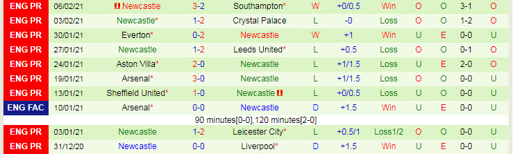 + Thống kê 10 trận gần nhất của Newcastle