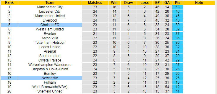 Trở lại với Ngoại hạng Anh, Chelsea tạm thời xếp ở vị trí thứ 5 và với những kết quả kể trên, họ đã mở ra cánh cửa trở lại với top 4 – nhóm tham dự Champions League. Nên biết, Chelsea cũng chỉ kém đội xếp thứ 4 Liverpool đúng 1 điểm và vẫn còn 1 trận chưa đá với Newcastle.
