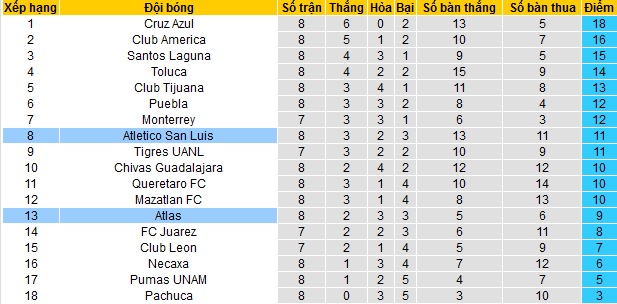 Bảng xếp hạng giải VĐQG Mexico trước vòng 9