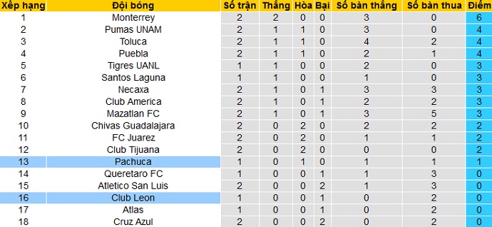 Bảng xếp hạng giải VĐQG Mexico vòng 3