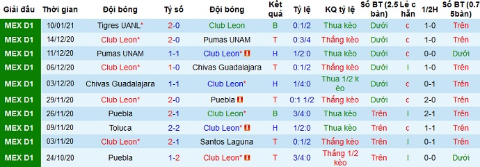 + Thống kê 10 trận gần nhất của Club León