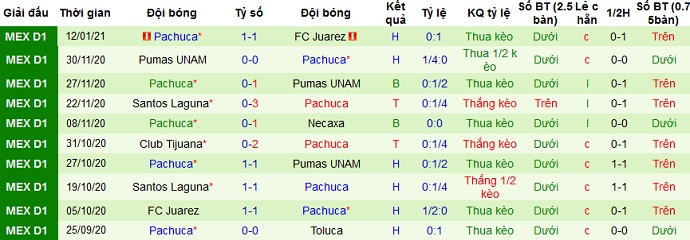 + Thống kê 10 trận gần nhất của Pachuca