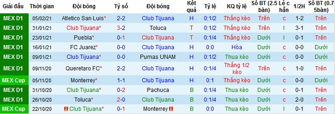 + Thống kê 10 trận gần nhất của Club Tijuana