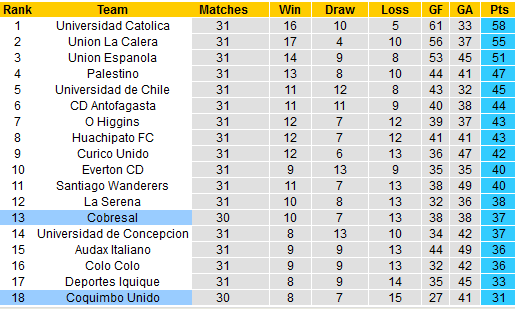 Đang đứng bét bảng, Coquimbo Unido vẫn còn cơ hội ở lại sân chơi cao nhất của bóng đá Chile khi ít hơn vị trí đá play-offs đúng 2 điểm và đội đứng ở thứ hạng an toàn 5 điểm. Tuy nhiên, không nhiều chuyên gia còn tin vào khả năng lật ngược thế cờ của họ.