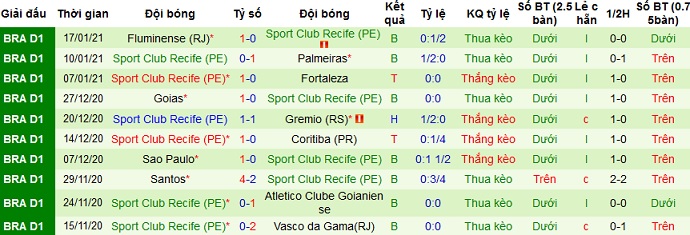 + Thống kê 10 trận gần nhất của Sport Recife