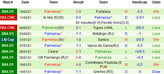 + Thống kê 10 trận gần nhất của Palmeiras