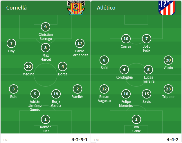 Thành tích kể từ đầu mùa của Cornella không thực sự ấn tượng với 11 điểm sau 9 vòng, đứng thứ 7 tại giải Hạng 3. Đây là phong độ khó so sánh trên phương diện bề nổi trước Atletico Madrid. Đội khách hiện đang dẫn đầu bảng La Liga với 2 điểm nhiều hơn Real Madrid dù đá ít hơn 2 trận.