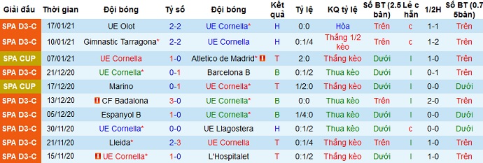 Trong 5 trận gần nhất Cornellà có được 2 trận thắng, 2 trận hòa và để thua 1 trận nhưng cả 2 trận thắng đội bóng đều có được tại cúp nhà vua. Trên sân nhà Cornellà cũng có được 3 trận thắng, 1 trận hòa và 1 trận thua ở 5 trận gần nhất tại đây.