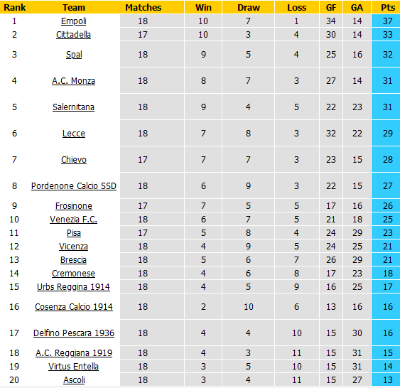 Qua 18 vòng đầu tiên, Cosenza mới có 2 trận thắng, được 16 điểm và tất nhiên đã bắt đầu lo lắng hơn cho nguy cơ rớt hạng. Đáng nói, Cosenza là đội có hàng tấn công vô hại nhất giải khi mới chọc thủng lưới đối phương 13 lần sau 18 trận.