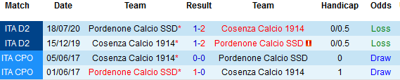 + Lịch sử đối đầu Cosenza vs Pordenone
