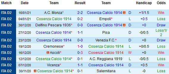 + Thống kê 10 trận gần nhất của Cosenza