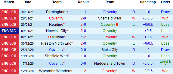 + Thống kê 10 trận gần nhất của Coventry