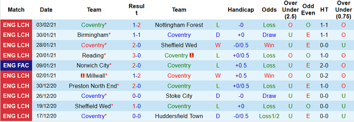 - Thống kê 10 trận gần nhất của Coventry