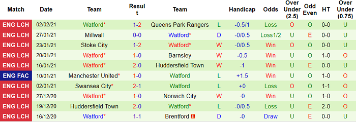 - Thống kê 10 trận gần nhất của Watford