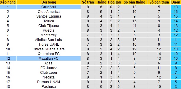 Trong khi đó Mazatlán đang đứng thứ 13 trên bảng xếp hạng với 10 điểm cũng sau 8 vòng đấu. Hiện Mazatlán đang có cùng bằng điểm với 2 đội đứng ngay trên nhưng kém về hiệu số bàn thắng.